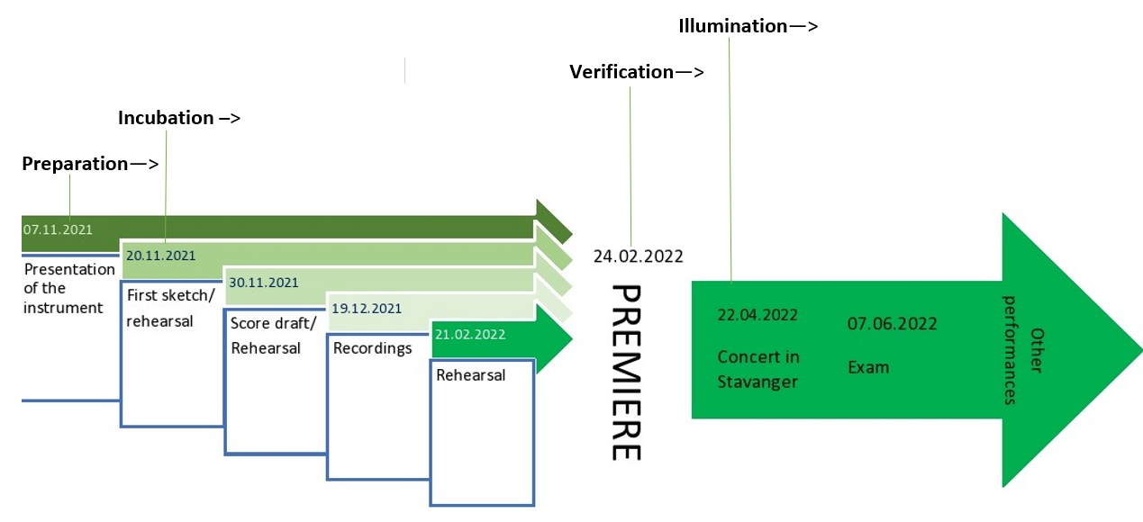 To reflect through this process, I employed an autoethnographic approach with some elements of grounded theory, allowing thematic patterns to emerge from our documentation and my reflective notes (Corbin and Strauss 2008). To articulate the evolving phases of co-creation, [2] I adopted Graham Wallas’s four-stage model of creativity (Wallas 1926). Though originally developed in psychology, this model and its modifications have been successfully applied to structure creative collaborations. Particularly relevant was Barbara Lüneburg’s thesis (2013), which draws on a modified version of Keith Sawyer’s creativity model (2012) to structure a performer’s collaborative practice. In my work, Wallas’s model offers a process-oriented framework that embraces both structured planning and intuitive emergence. In his book The Art of Thought (1926), Wallas outlines four stages of the creative process: