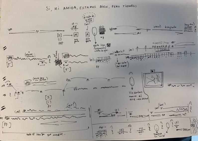 From the very first sketch of the score (Fig. 4), one can already see visual traces of this exchange. The emotional and structural content of the work appears to be drawn directly from the first presentation and from the language we had developed to discuss the instrument and its potential.