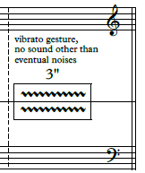 In the sketch, one can see references — direct or indirect — to techniques or fragments I had shown to Francisco and that he responded to. For example, the irregular wavy lines evoke the trembling effect found in Dmitri Kourliandski’s Shiver (2013) or in my own improvisations. Another reference to existing repertoire that influenced Francisco early on was the rubbing noise produced by the hand moving along the body of the instrument. I discovered and developed this technique while working on Sehyung Kim’s QI II, [2] where these noises appear in the final section, which does not contain any tones. In that passage, the right hand gradually moves along the keyboard from the top to the bottom, still trembling but without touching the keys, but with extreme tension to keep the gesture of shivering. This trembling effect became an essential technique in the piece, and during rehearsals with Sehyung we noticed how certain incidental sounds — rubbing, clothing fabric noise, mechanical clicks — emerged inevitably from the physical gesture. Rather than eliminating them, we decided to embrace and emphasize this gesture as part of the sonic texture. [3]