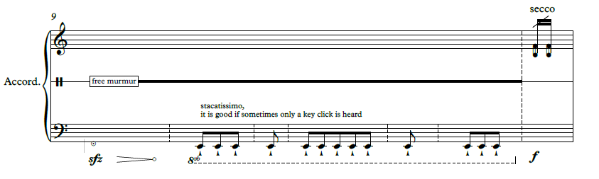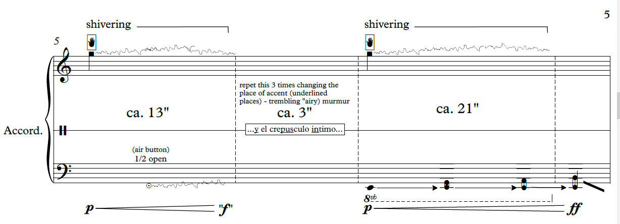 When introducing the accordion to Francisco, I demonstrated this technique and shared its background. He was fascinated by the fragility of the sounds and particularly drawn to the gestural, physical nature of the technique. His early sketches and the first draft of the score reflected this interest, suggesting extensive use of such creaking sounds. However, as the piece developed, many of these were eventually replaced with more traditional materials.