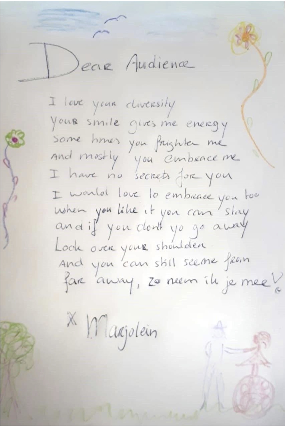 Art being accessible is one of my main values and the reason to work on the street. This accessibility is not only about the audience but also about who I want to create performances with. This summer I will create a performance with def youngsters, we want to create a silent parade, where our movements make the ‘noise’.