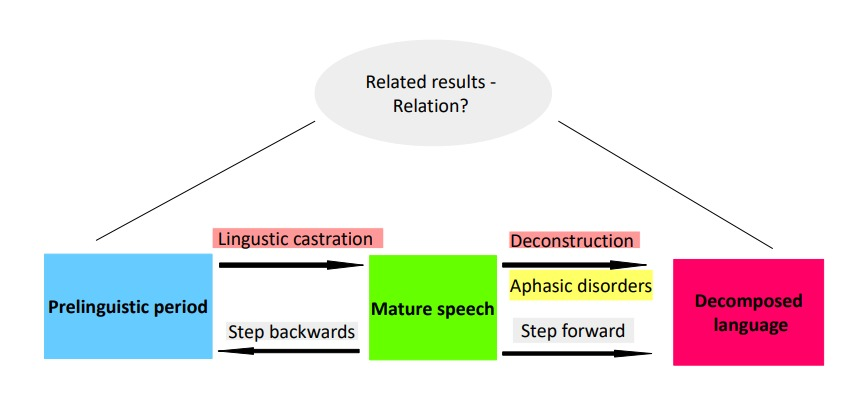 Apart from that, over the first arrow lies the phrase “Linguistic castration” (a term often used by Selma Freiberg to describe the loss of the linguistic abundance of the prelinguistic stage). This is the term used to describe the passage from prelinguistic period to mature speech, in which the toddler loses all the limitless abilities they had till that moment. It is a dynamic process, in the same way that deconstruction of the language is a dynamic process as well.