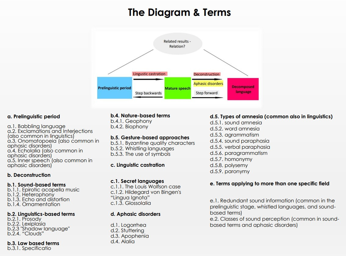 -Artificial (“Deconstruction”): This process is related to a conscious choice of deconstruction, by someone who already possesses the tools of organized healthy speech. The roots of such processes can be found in different areas, arts or sciences, such as the art of sound, linguistics, psychology and its many categorizations, even law.