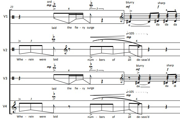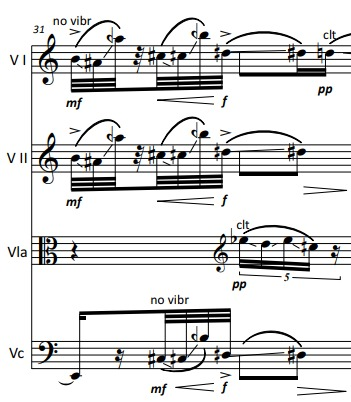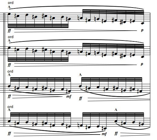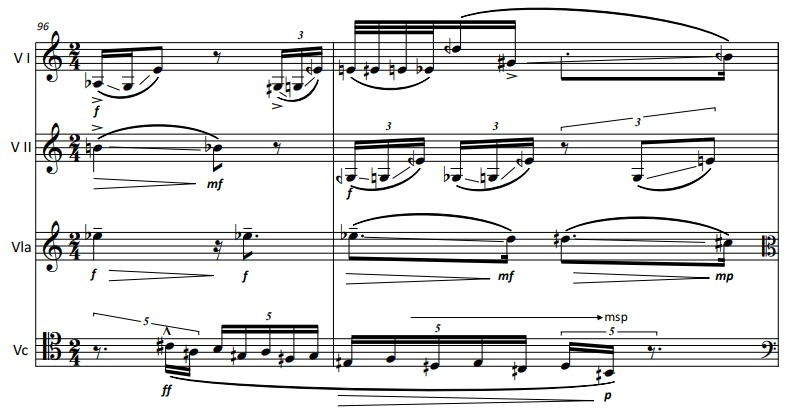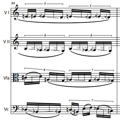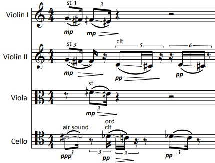At about 3/5 of the piece, a speech texture starts in the cello, which slowly spreads to all the strings. This is a 4-voice example: