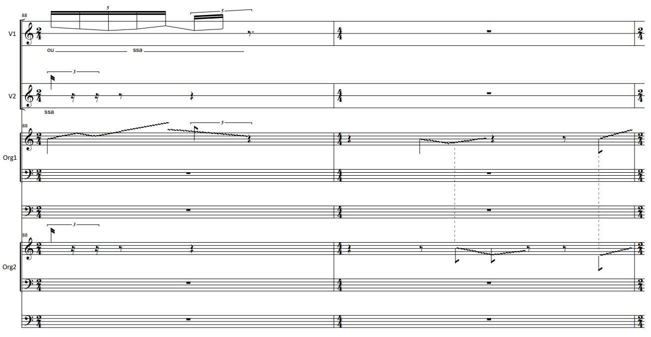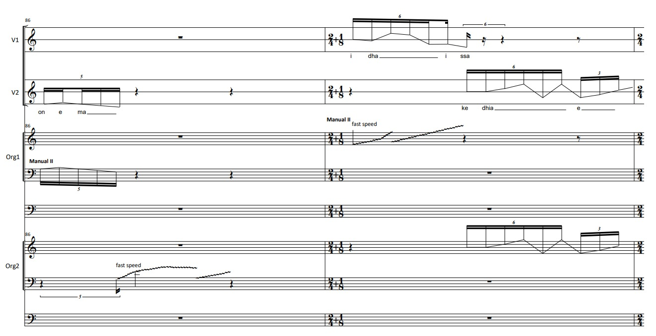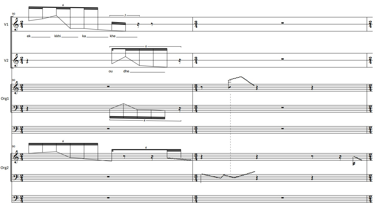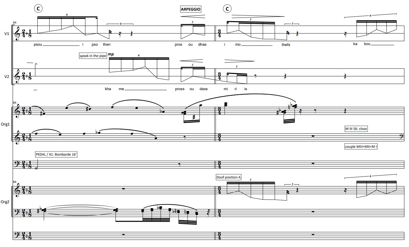 Τhe idea to use secret language is based on the ecstatic state in which the Bacchae are entering when executing their rituals. The fact that they are entering a “higher” state of consciousness opened up a window in which, at a certain moment of the piece, they would get far from the way their sound was until that point. In comparison to the motivic and sharp way of reciting the text, the two singers’ sound becomes plastic, floaty and light. The way I dealt with the text is also related to the idea of the “shadow language”. Ι chose text fragments in which Bacchae are in trance, while slaughtering Penthefs. In most of the cases I kept the first syllable of a word, stretching it, in order to enhance the plasticity of the sound, in comparison to the “sharpness” of ancient Greek, especially in such a speed. In parallel, the organs imitate this plastic movement using half stops creating a heterophonic plastic texture.