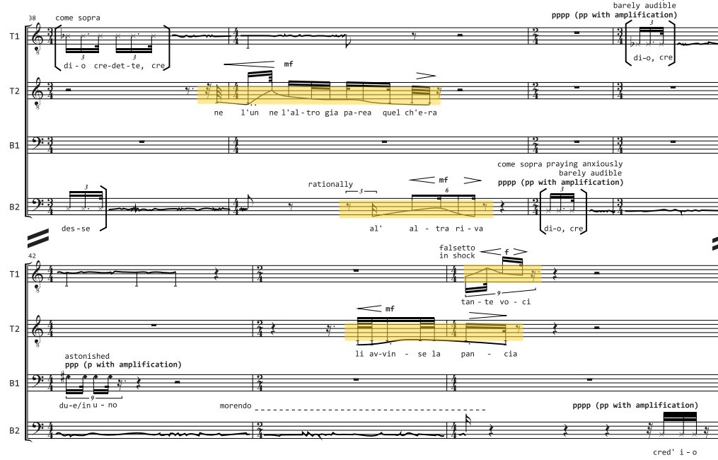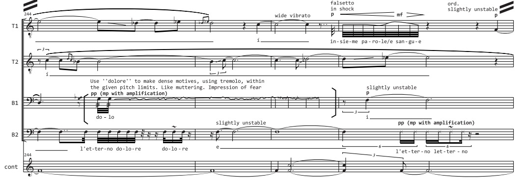 My first organized approach towards composing the voice happened in 2016. Since I was a teenager I had great fascination for Dante's Inferno. In 2016 I decided to take the original text of Inferno, put a microphone in front of me and for months improvised vocal gestures on the text, by dismantling and reconstructing words and phrases, guided by the pulse of the language and my youth's imagination of Hell. The result was a 4-voice acapella piece, which later became a music theatre piece in the Greek National Opera, called “Return, a polyphonic work based on the original text of Dante’s Inferno”.