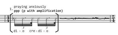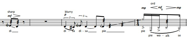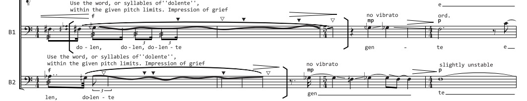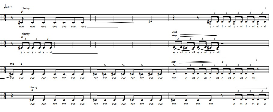 In many parts of the piece a special staff is used – the one with 3 lines, corresponding to c4, e4 and g4. This sets the ground for the main female speaking range. It also puts a limit between the speaking and the singing approach, related of course to the more classical Sprechgesang and Sprechstimme terms: