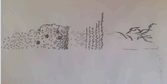 Eventually, after months of working on the piece, I had one of the most vivid dreams of my life – I was on a rocky village on the mountains of Epirus in Northern Greece, in front of a semi destroyed stone house and an old well. The dream had colours of white and grey pallet, apart from a snake outside the house fence, which had light red stripes. At some point the snake jumped and bit me. I name the piece “Grey earth, serpent”, after the dream.