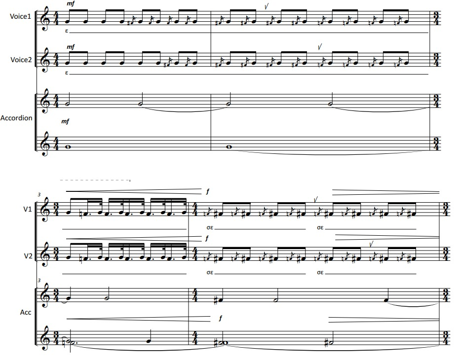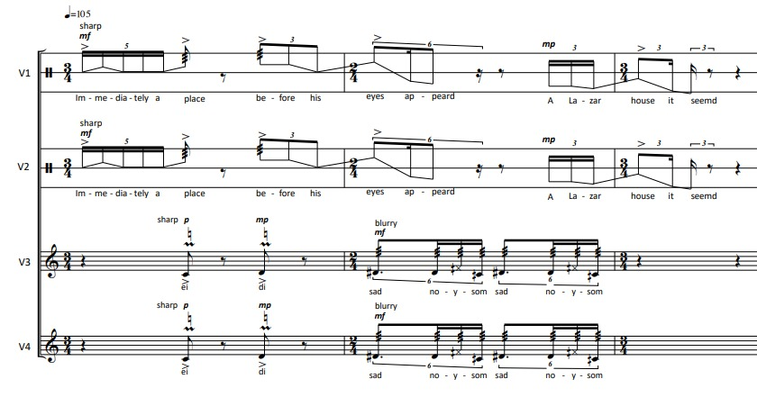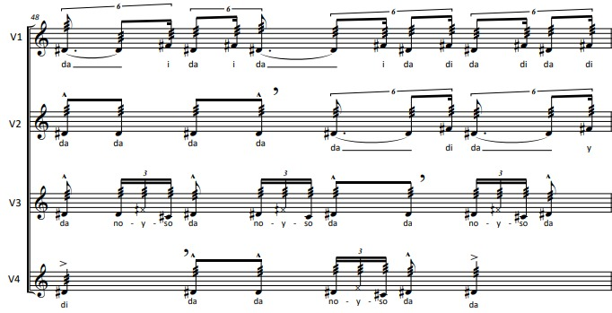 Another prominent texture of the piece is the long drones, consisting of phonemes or relics of the text used. This results in forceful events, since, most of the times, the 4 singers perform them simultaneously, heterophonically (in the first example) or with a harmonic-vertical approach.