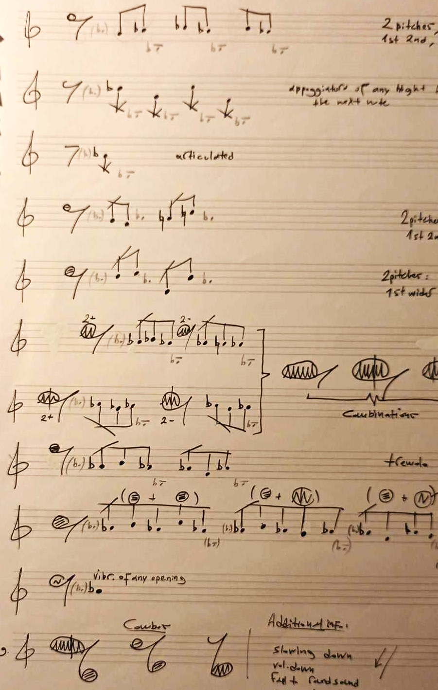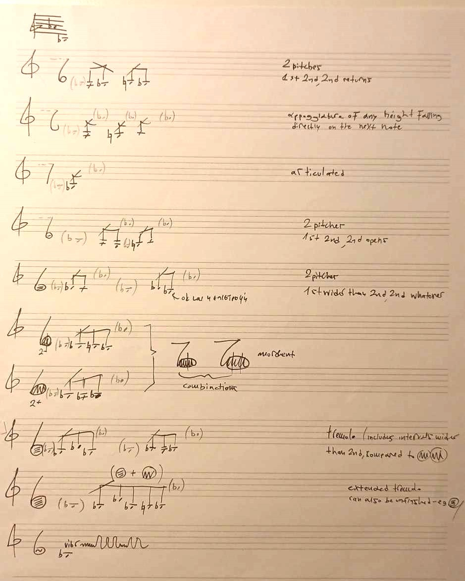 This is a first sketch from my personal notes on how I visualized these sound events. I took special care of their contour, register and prosody. The aim was to create gestures with clearly audible components.