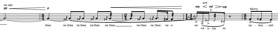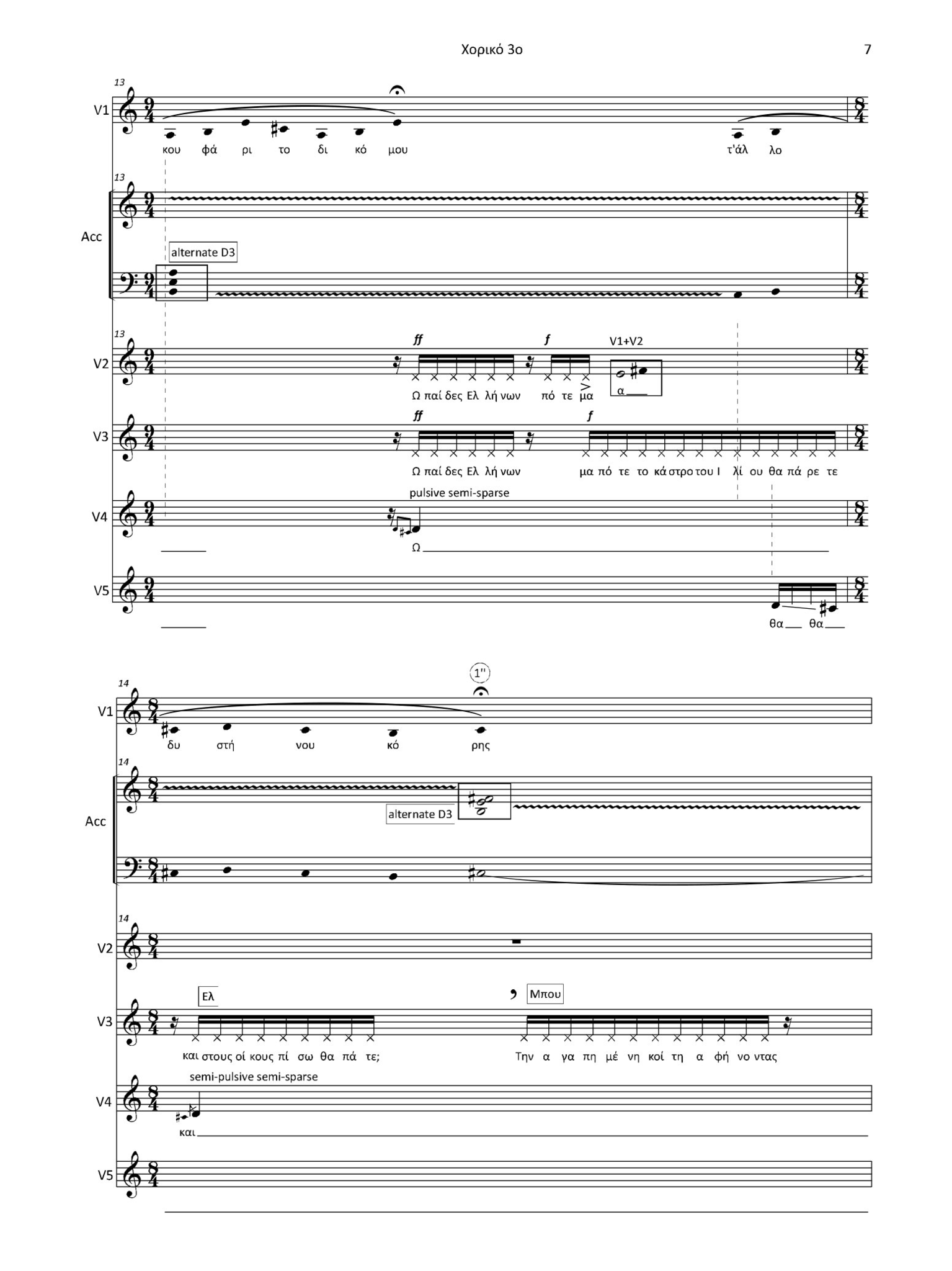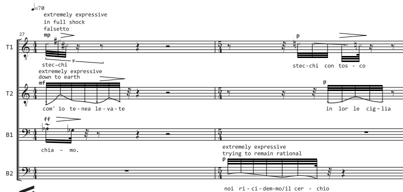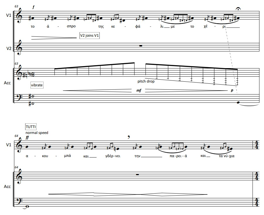 This piece was the starting point for my approach to vocal music, in many ways. It was mostly based on improvisation. I was not understanding the text clearly, so it was mostly based on my perception of the language’s sound. I was thinking in “gestures” rather than melodies, taking care of the contour, the combination of ranges and dynamic waves. These are all depicted in the opening bars of the piece, which function like a “broken machine” which, little by little, finds a common pulse. The points of the gestures’ interlocking are very important, since they add the indistinct “pulsive” element of this block. The interlockings are based on the stressed words of the phrases used.