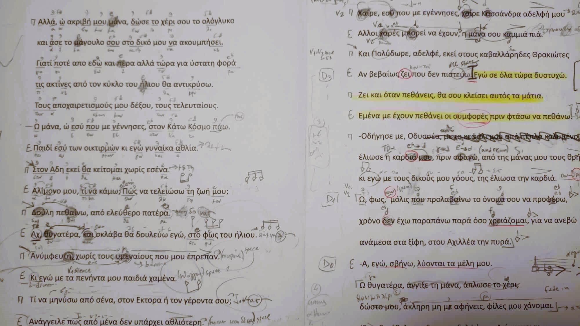Shadow language was one of the tools which gave the chorus its specific colour / character. A characteristic moment is the farewell of Hecuba to her daughter Polyxeni. The following paper shows the way I approached this fragment: