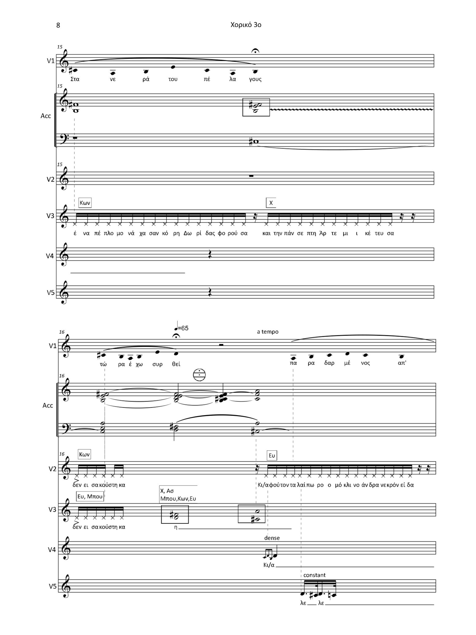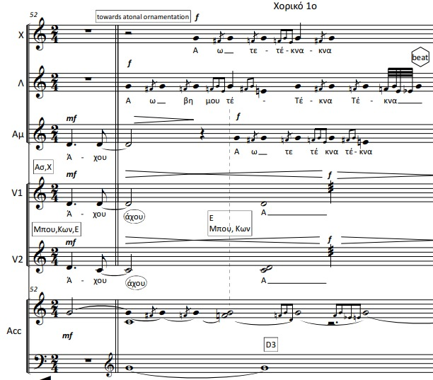 I used this word as a polyphonic exclamation cloud at one of the main choral parts, in which the female chorus refers to the horrible course of Hecuba’s life. In fact, I placed this cloud exactly after the phrase “ολέθριο κακό” (describing something unbearable), thus, exactly after the word “kakò”. In this way, grammatically speaking, the lyrics move from a literal word to the distortion of this word, exclaimed in a way that resembles an actual lamentation, creating a powerful sonic result.