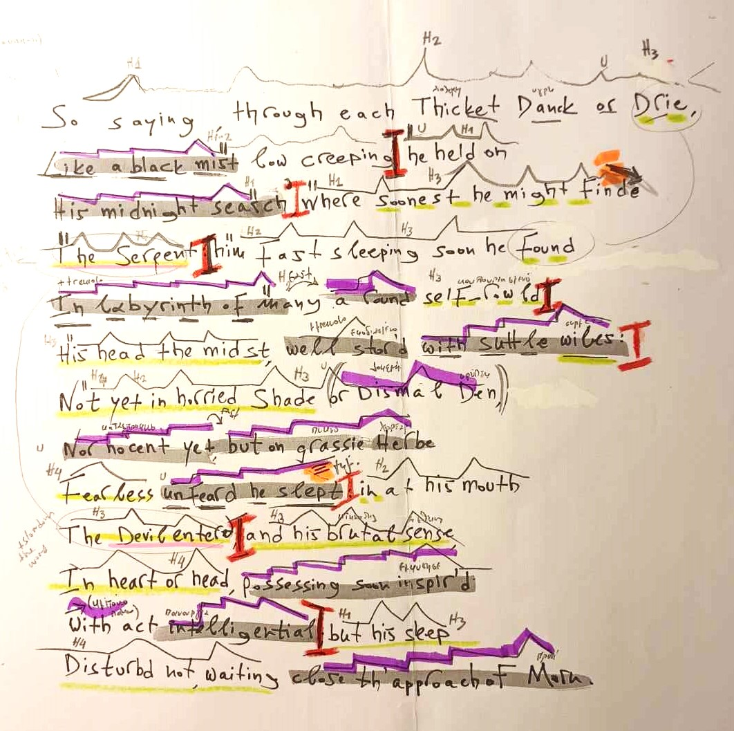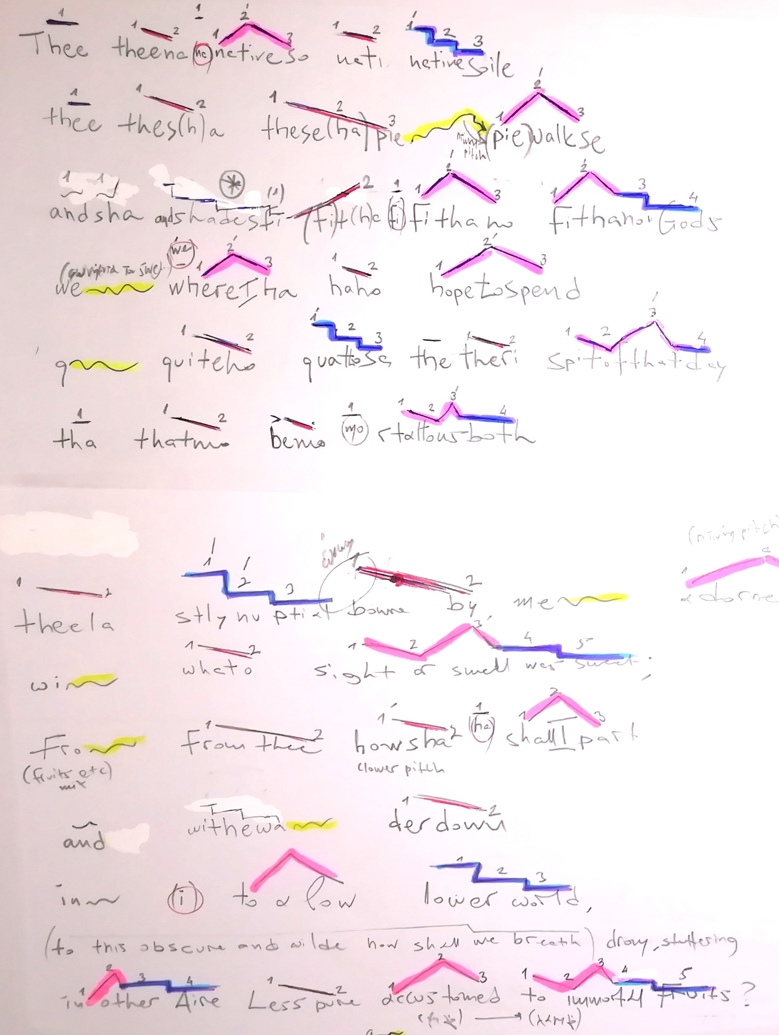 One of the first ideas I had when dealing with the event of Eve’s lamenting losing Paradise, was to create a quasi-stuttering texture, which would dramaturgically coincide with an imaginary way in which such a text could be recited. What I did was to take the relevant text (Paradise Lost, book XI, verses 268-285), make the words collide against each other and combine them in different ways, creating new words. Also, above the relevant text, I created my own symbols-directions which represent the contour of each gesture: