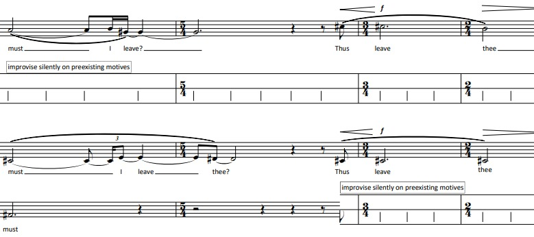 The character of this impression is enhanced by the way the accents of the intertwined phrases are treated. Looking at the previous examples, there are cases where I synchronize the stress of the words which belong to the different intertwined phrases. This results in a smoother interlocking. There are other cases where the stress of a word which belongs to different lines affects the predictable pulse-flow and creates tension: