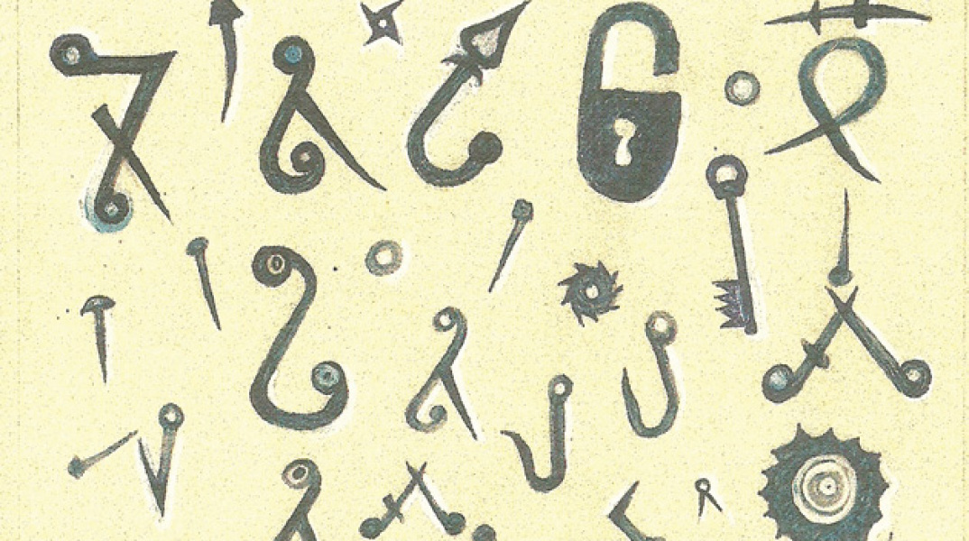 This is a painting by the Greek painter Yorgos Makris, titled “Keylocks from Hade's prison, collected from Byzantine paintings of the Resurrection”. I found it on the front page of the Greek book “Σύσσημον”, written by the Greek poet Nikos Panagiotopoulos.