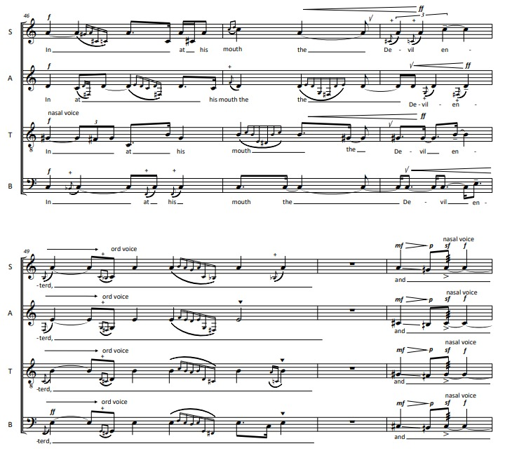 The piece incorporates theatrical directions. The 4 singers all have different characters, demonstrated by different “ways” of singing: