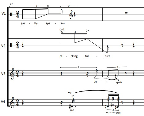The feeling of unstoppable individual talking is spread throughout the whole piece, pointing out the feeling of despair and isolation of the four singers-characters. This is an example of such a texture: