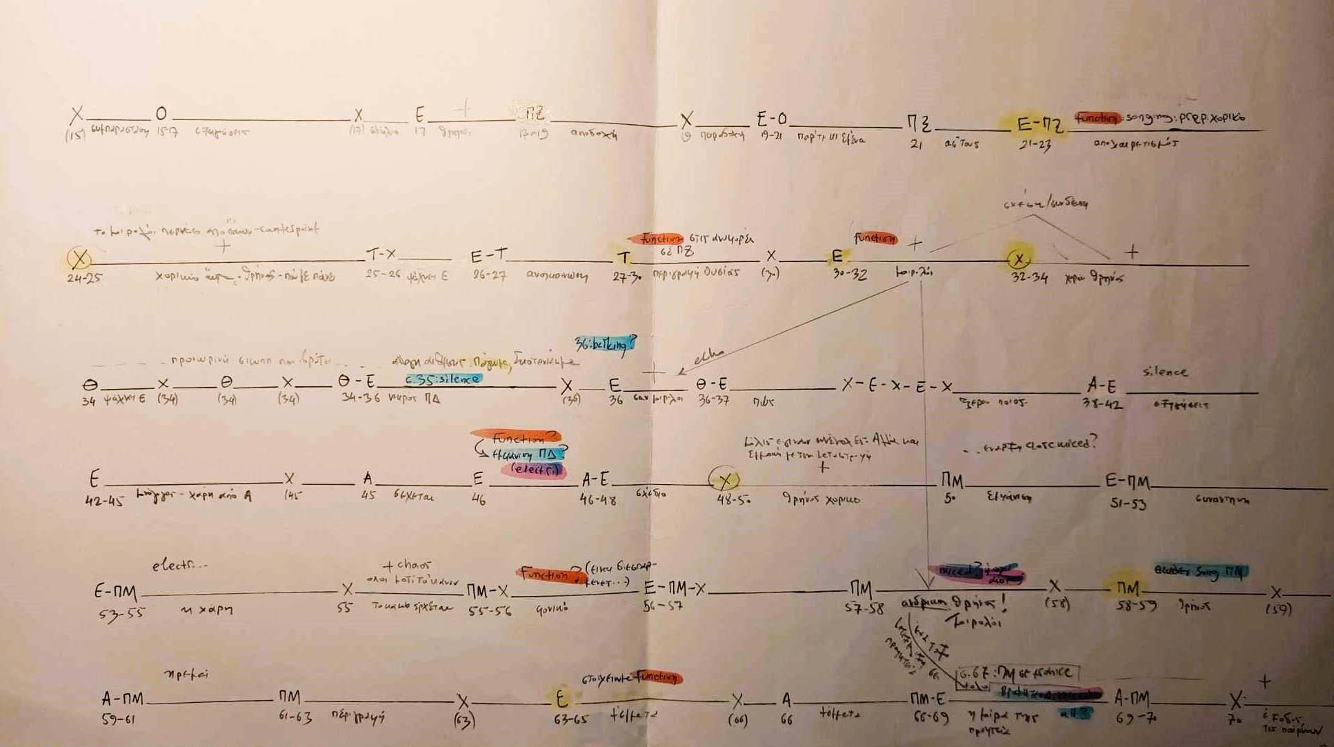 This is how the first organization of this material was made. With orange I marked the “function moments”, with yellow the musical moments and, with pink, the electronic musical events.