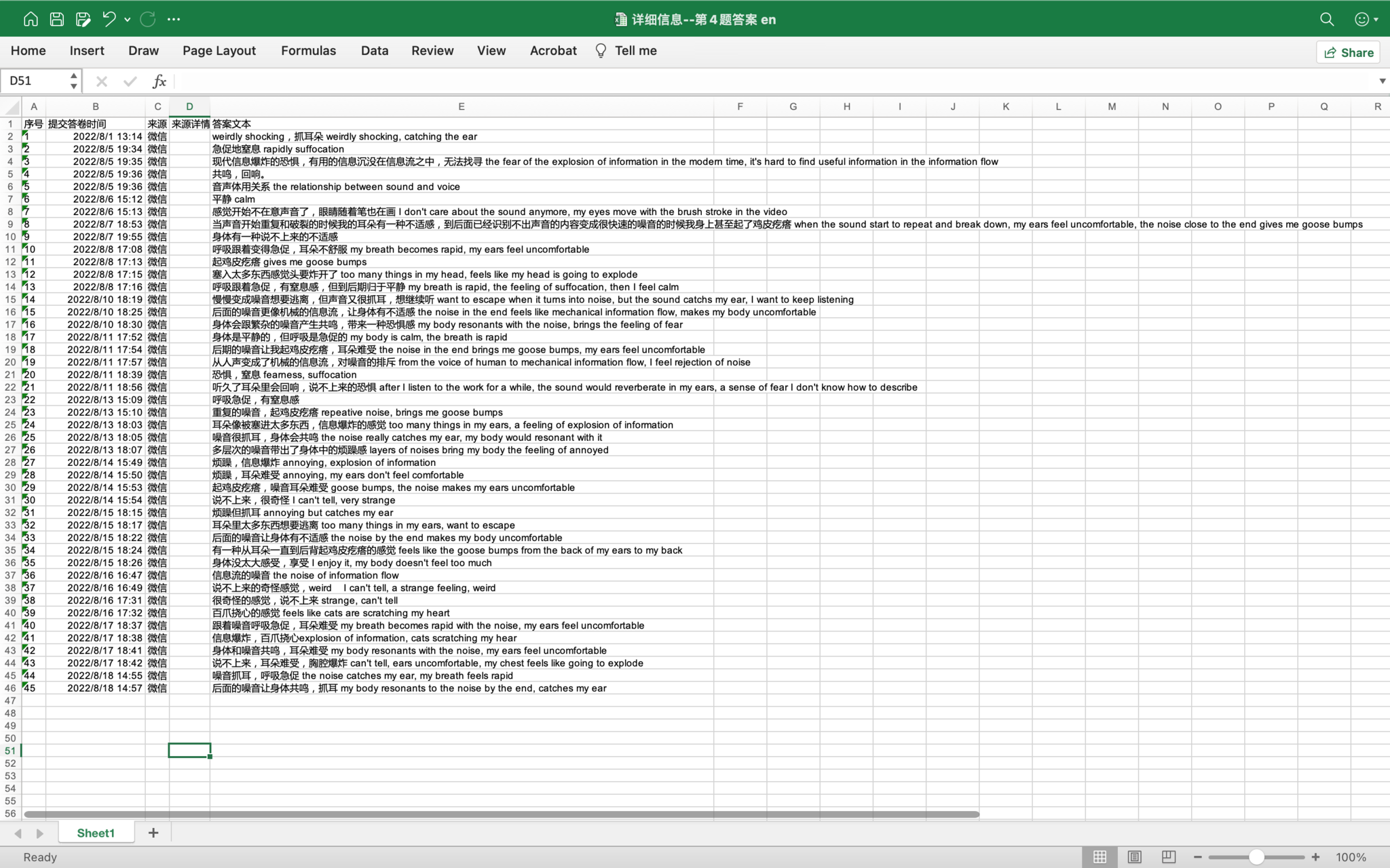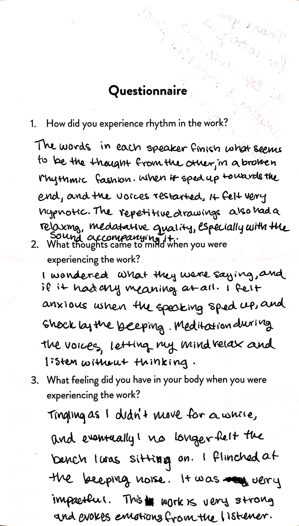 4. What feeling did you have in your body when you were experiencing the work? My breath became rapid with the noise, my ears felt uncomfortable.