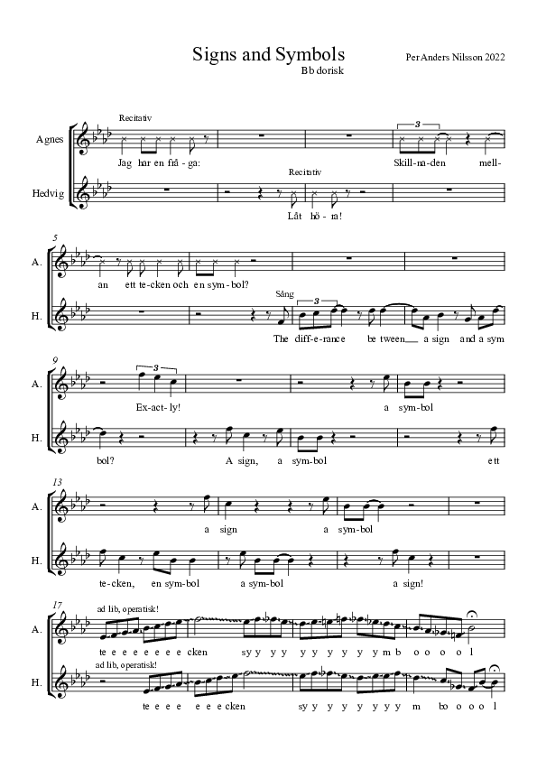 3) Signs and symbols by Per Anders Nilsson is a duett for the two soprano singers and live electronics. A kind of "Q and A" form where Agnes is asking and Hedvig answers about signs and symbols.
