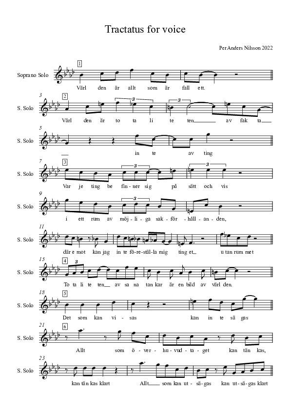 This composition uses ten selected paragraphs in Swedish from Ludvig Wittgenstein's Tractatus Philosophicus Logicus first published in 1922. The selected paragraphs are as follows:
