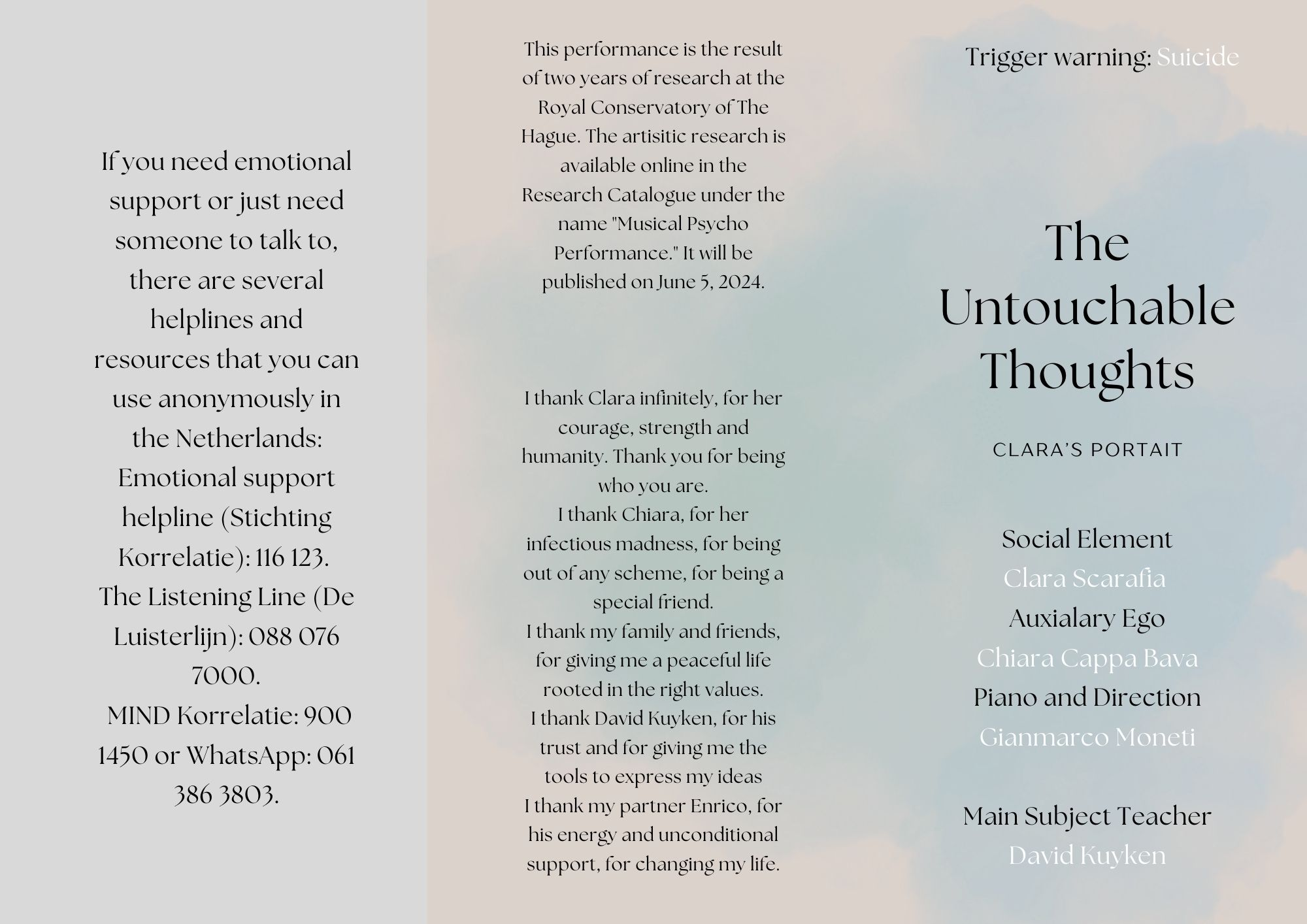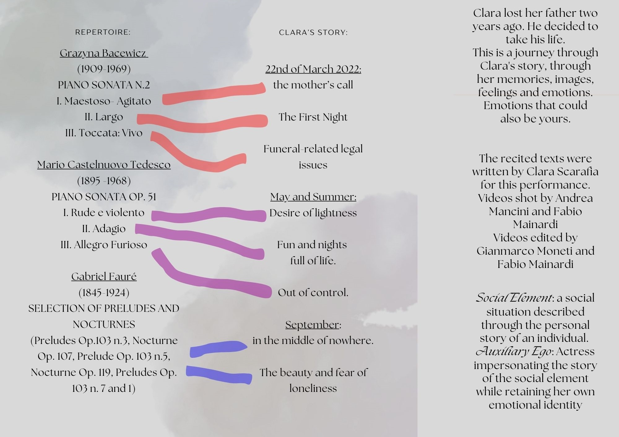DISCLAIMER: This section was added after the correction and discussion (10th of April 2024) of the artistic research, so it was not included in the evaluation. Reported is the full video of my Final Master Recital (22nd of May 2024) in which I performed the show that was the result of the study of this artistic research. The poster, content warning, and program associated with this performance are also included.