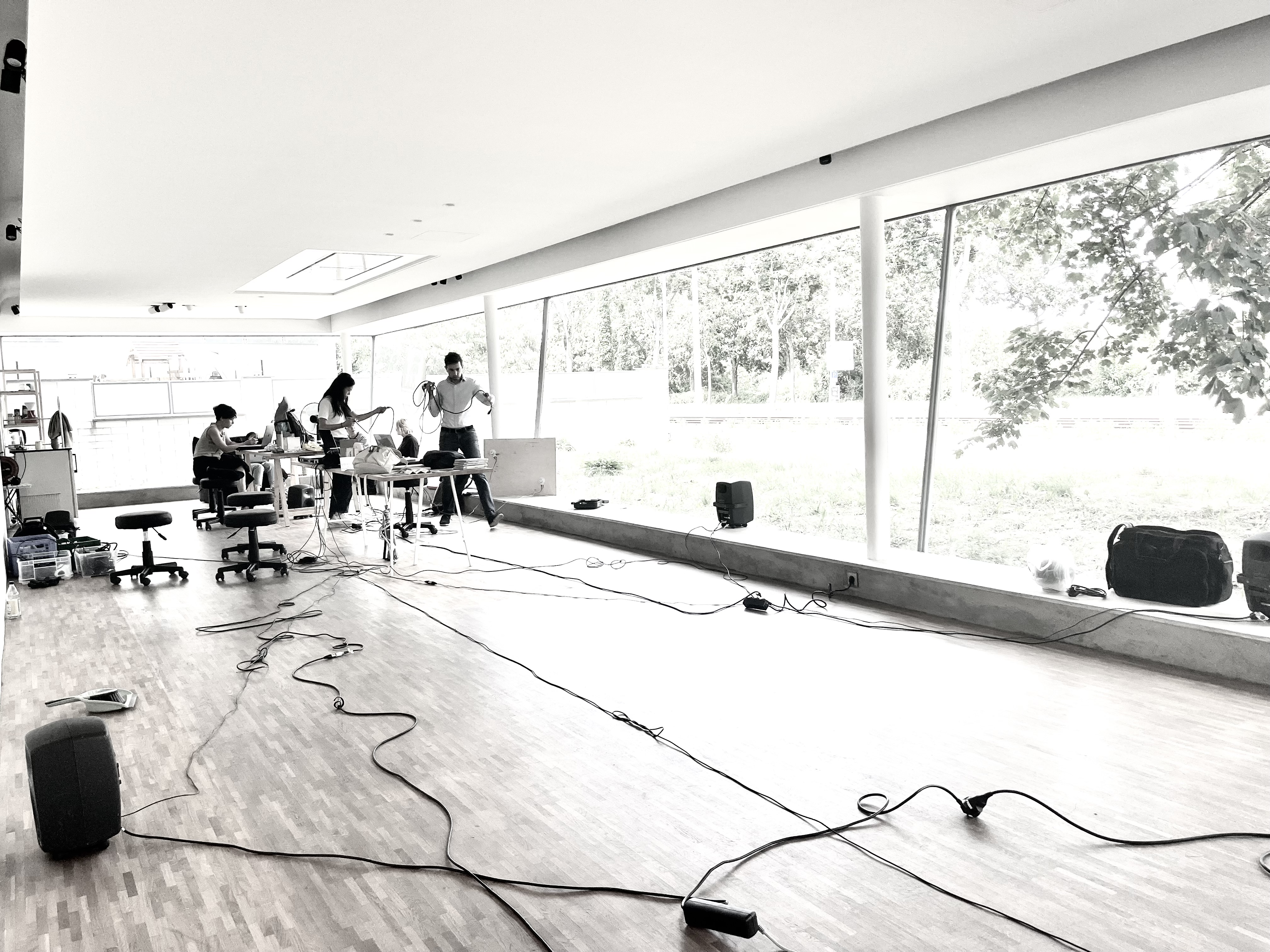 Then, different spaces at HfG were explored acoustically, producing sound with various means, like voice, objects, and loudspeakers to study and discuss the "room's reactions and behaviours".