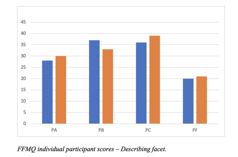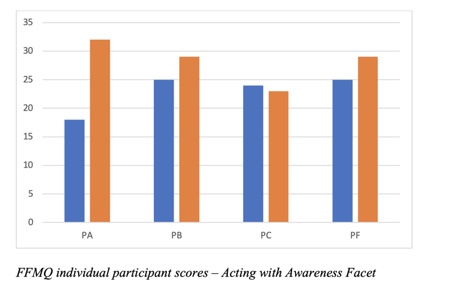 Table 1 shows the pre- and post-mean scores for the five facets for all participants combined. Data show an increase for all five mindfulness facets, particularly noticeable for the “Acting with Awareness” and “Non-Judge” facets.
