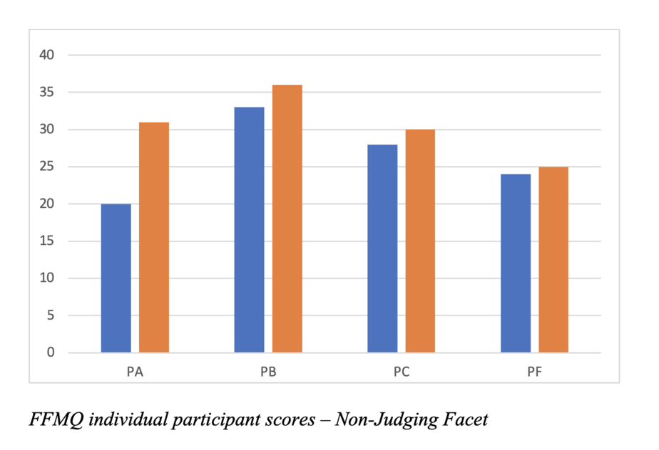The Non-Judge facet is characterized by statements such as ’I criticize myself for having irrational or inappropriate emotions.’ It covers aspects of self-judgment when emotions or thoughts are perceived as good or bad followed by mental self-punishment. All participants seemed to improve in this facet of the FFMQ. However, participants B and C slightly decreased in this facet for the MfM, which contradicts the FFMQ. These colliding results might come from an insufficient amount of meditation time, which may be necessary to change how musicians judge themselves.