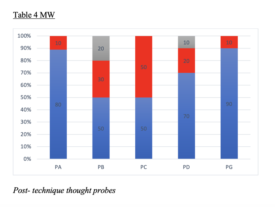 From the beginning to the end of the intervention, Participants A, D, and G improved their focus or became less distracted while practicing their technical work. On the other hand, Participants B and C showed more distractibility after the intervention. These two drops in attention could be due to, again, contextual variables contained in data contained in the follow-up questionnaires regarding motivation, fatigue, and worry levels. In the post-intervention (Table 4MW), Participant B was tired, worried, and not motivated. Participant C was also only moderately motivated and worried. These have been demonstrated to be influential contextual reasons for the occurrence of mind-wandering (Robinson et al., 2020).