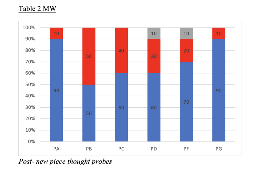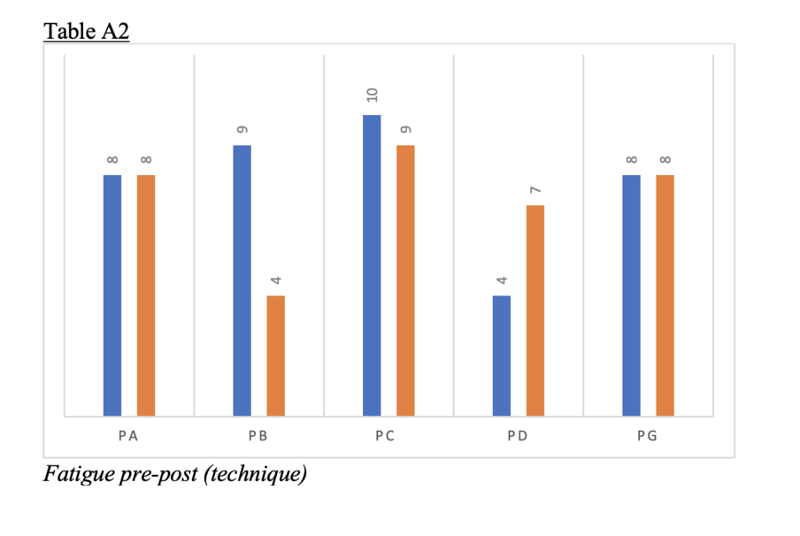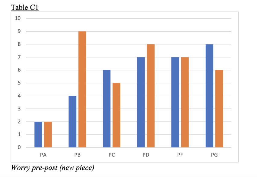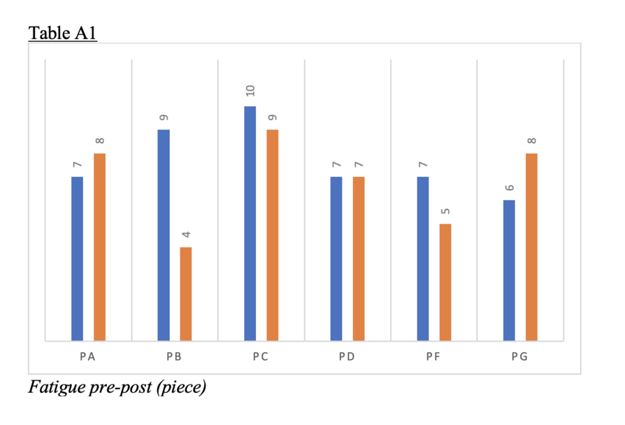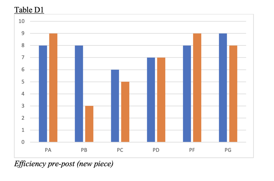Regarding the new piece, we observe improvements in terms of attention in participants A and G from pre- to post-test. That is, these two violinists caught themselves more times focused than distracted when notified by the random alarm. On the other hand, we also observe an increase in mind-wandering rates in Participants B and C. This may be due to insufficient meditation time to achieve more resilience to distraction, but also due to a very noticeable increase in fatigue (Table A1) worry (Table C1), and a decrease in motivation (Table B1). In the interview, participant B commented having been sick during indicated when carrying out the post-experiment questionnaires. In the case of Participant D, we observe high levels of worry (Table C1), and moderate motivation, but the only difference we observe from pre- to post-thought probes is an outside distraction (o.d) (Table 2 MW) (i.e. “taking the phone because he was feeling tired”)