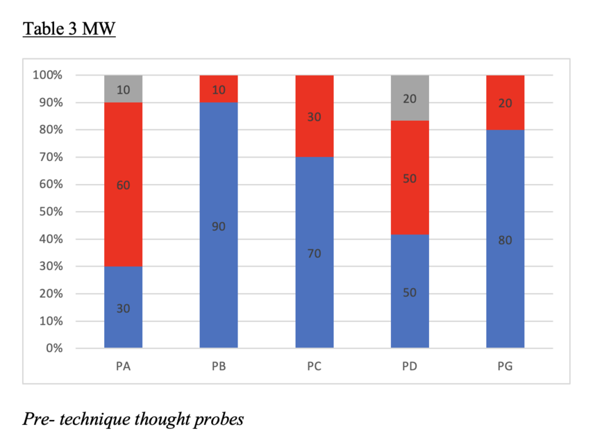 Regarding the thought probes during technique practice (Table 3MW and Table 4MW) we can observe that participants tended to ruminate or get distracted more easily than when practicing new pieces. According to the literature when carrying out motor tasks that have already been proceduralized and are implicit and automatic in the individual, these would not require so much focus or cognitive effort, and therefore musicians, in this case, would be more likely to drift away or to fall into rumination (Kane et al., 2007, Levinson et al., 2012; Stawarczyk et al., 2014).