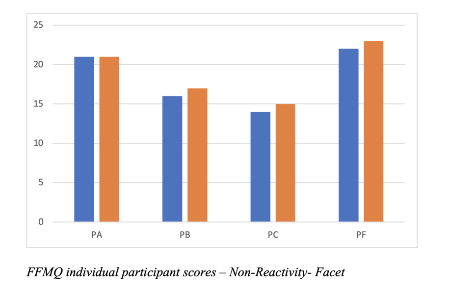 The Non-React facet is characterized by statements such as: "I perceive my feelings and emotions without having to react to them". It includes aspects such as watching negative thoughts, emotions, distressing feelings, or images and being calm before taking action or responding to a situation. Participant A experienced the biggest increase in her perception and non-reaction to feelings in a musical context. This improvement is reflected in her report when she claimed that through meditating, she could see her impatience and learn to slow down. The rest of the participants slightly improved from pre to post-intervention in the FFMQ or remained the same from pre- to post-intervention for the MfM (Participants B and C). Participant F's increase in non-react for both questionnaires is also reflected in what she expressed during her interview at the end of this statement: “By focusing on breathing during the meditation, I was more aware of it during my practice session after, especially in the moments where my breath gets stuck, and I feel less grounded/relaxed. Usually, I notice this too, without the meditation tool, but the meditation helped me with recognizing it quicker and also knowing what to do when the tension comes and when the tension comes and when my breath gets stuck” “and with reassuring myself that it’s okay when it happens.”