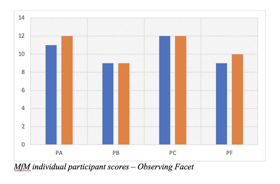 The Observe facet in the FFMQ is characterized by statements such as ‘When I’m walking, I deliberately notice the sensations of my body moving.’ It covers the awareness of information picked up by the senses from the participant’s surroundings and the effect they have on the body or mind. In the MfM it refers to the physical sensations or sounds when playing as well as muscular or slight changes of sound. Participants A, C, and F improved in this facet in the FFMQ and only A and F did in the MfM.