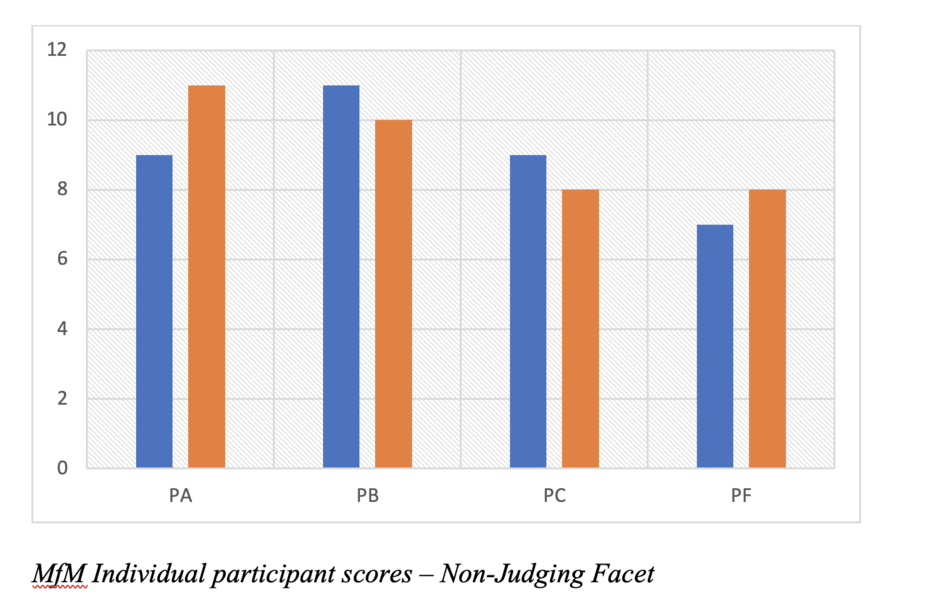 The Non-Judge facet is characterized by statements such as ’I criticize myself for having irrational or inappropriate emotions.’ It covers aspects of self-judgment when emotions or thoughts are perceived as good or bad followed by mental self-punishment. All participants seemed to improve in this facet of the FFMQ. However, participants B and C slightly decreased in this facet for the MfM, which contradicts the FFMQ. These colliding results might come from an insufficient amount of meditation time, which may be necessary to change how musicians judge themselves.