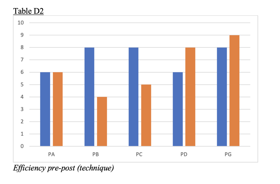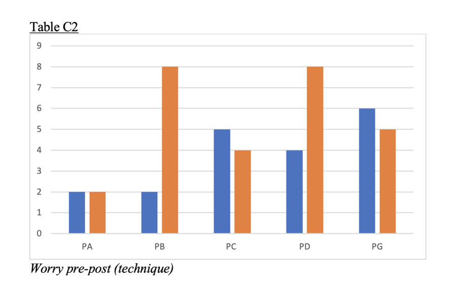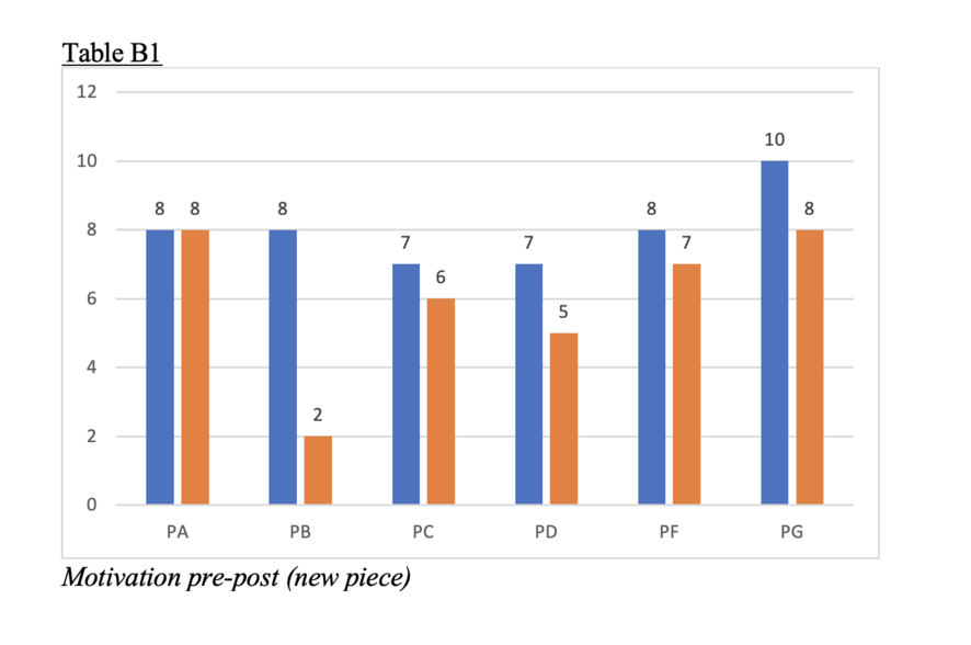 Regarding the new piece, we observe improvements in terms of attention in participants A and G from pre- to post-test. That is, these two violinists caught themselves more times focused than distracted when notified by the random alarm. On the other hand, we also observe an increase in mind-wandering rates in Participants B and C. This may be due to insufficient meditation time to achieve more resilience to distraction, but also due to a very noticeable increase in fatigue (Table A1) worry (Table C1), and a decrease in motivation (Table B1). In the interview, participant B commented having been sick during indicated when carrying out the post-experiment questionnaires. In the case of Participant D, we observe high levels of worry (Table C1), and moderate motivation, but the only difference we observe from pre- to post-thought probes is an outside distraction (o.d) (Table 2 MW) (i.e. “taking the phone because he was feeling tired”)