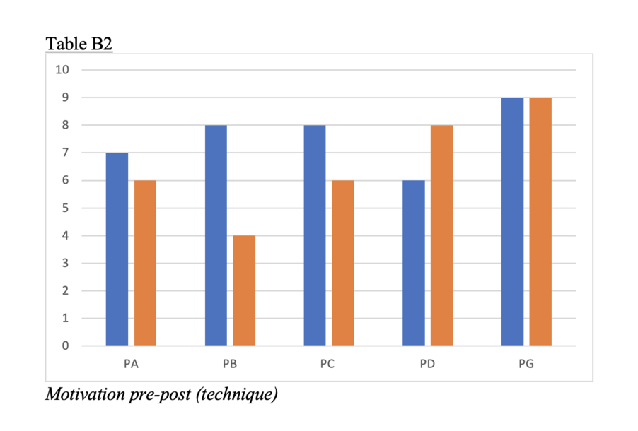 From the beginning to the end of the intervention, Participants A, D, and G improved their focus or became less distracted while practicing their technical work. On the other hand, Participants B and C showed more distractibility after the intervention. These two drops in attention could be due to, again, contextual variables contained in data contained in the follow-up questionnaires regarding motivation, fatigue, and worry levels. In the post-intervention (Table 4MW), Participant B was tired, worried, and not motivated. Participant C was also only moderately motivated and worried. These have been demonstrated to be influential contextual reasons for the occurrence of mind-wandering (Robinson et al., 2020).