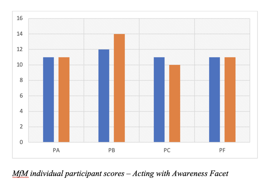 The Observe facet in the FFMQ is characterized by statements such as ‘When I’m walking, I deliberately notice the sensations of my body moving.’ It covers the awareness of information picked up by the senses from the participant’s surroundings and the effect they have on the body or mind. In the MfM it refers to the physical sensations or sounds when playing as well as muscular or slight changes of sound. Participants A, C, and F improved in this facet in the FFMQ and only A and F did in the MfM.