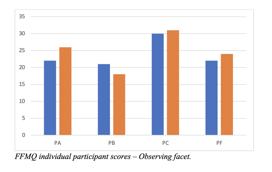 The Observe facet in the FFMQ is characterized by statements such as ‘When I’m walking, I deliberately notice the sensations of my body moving.’ It covers the awareness of information picked up by the senses from the participant’s surroundings and the effect they have on the body or mind. In the MfM it refers to the physical sensations or sounds when playing as well as muscular or slight changes of sound. Participants A, C, and F improved in this facet in the FFMQ and only A and F did in the MfM.