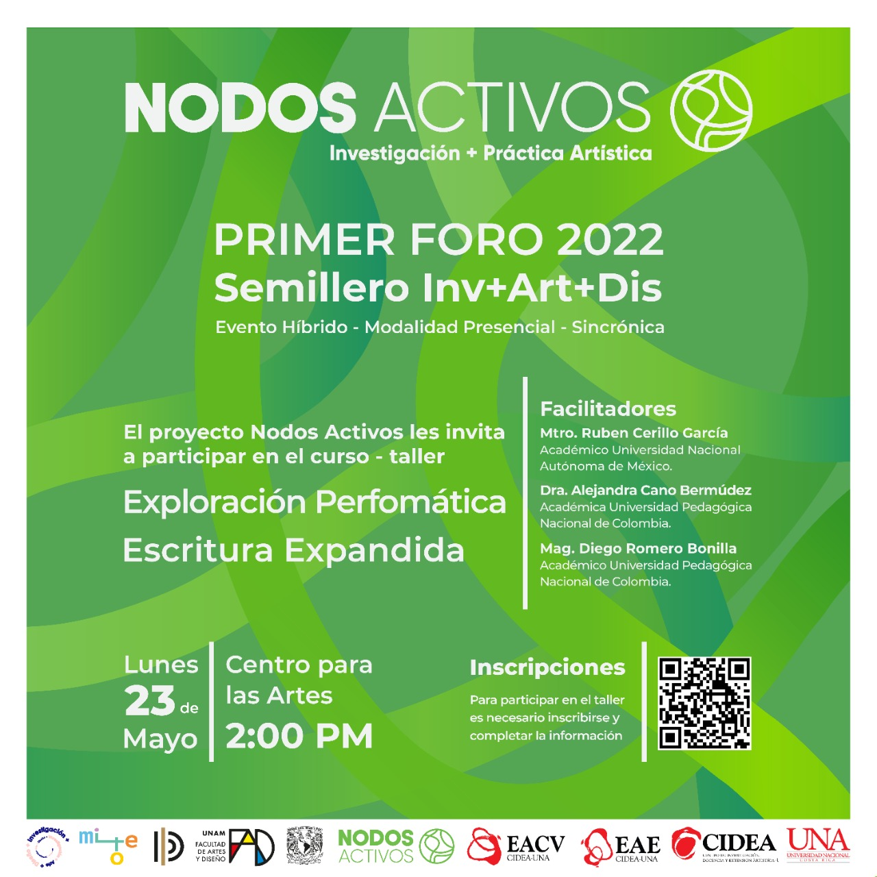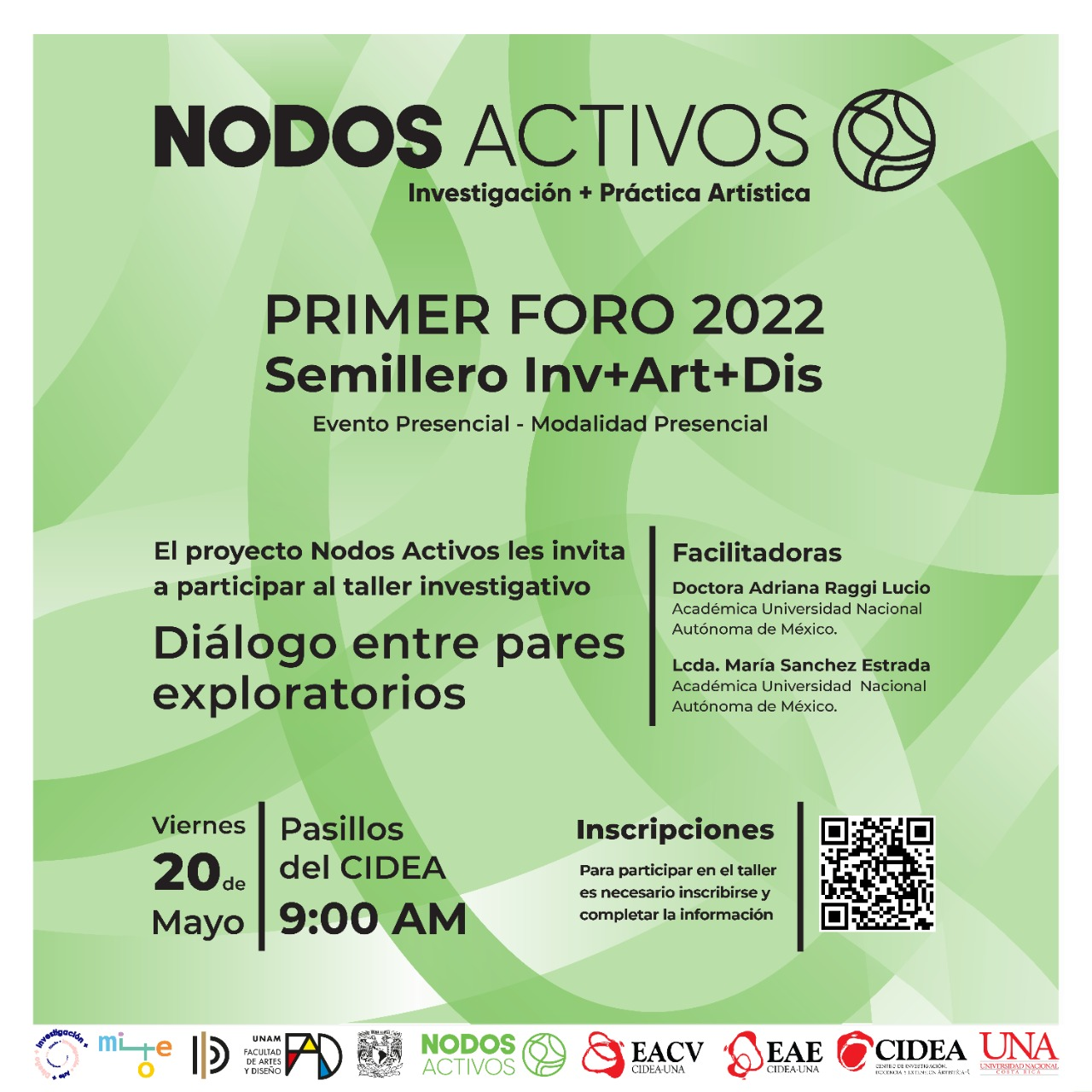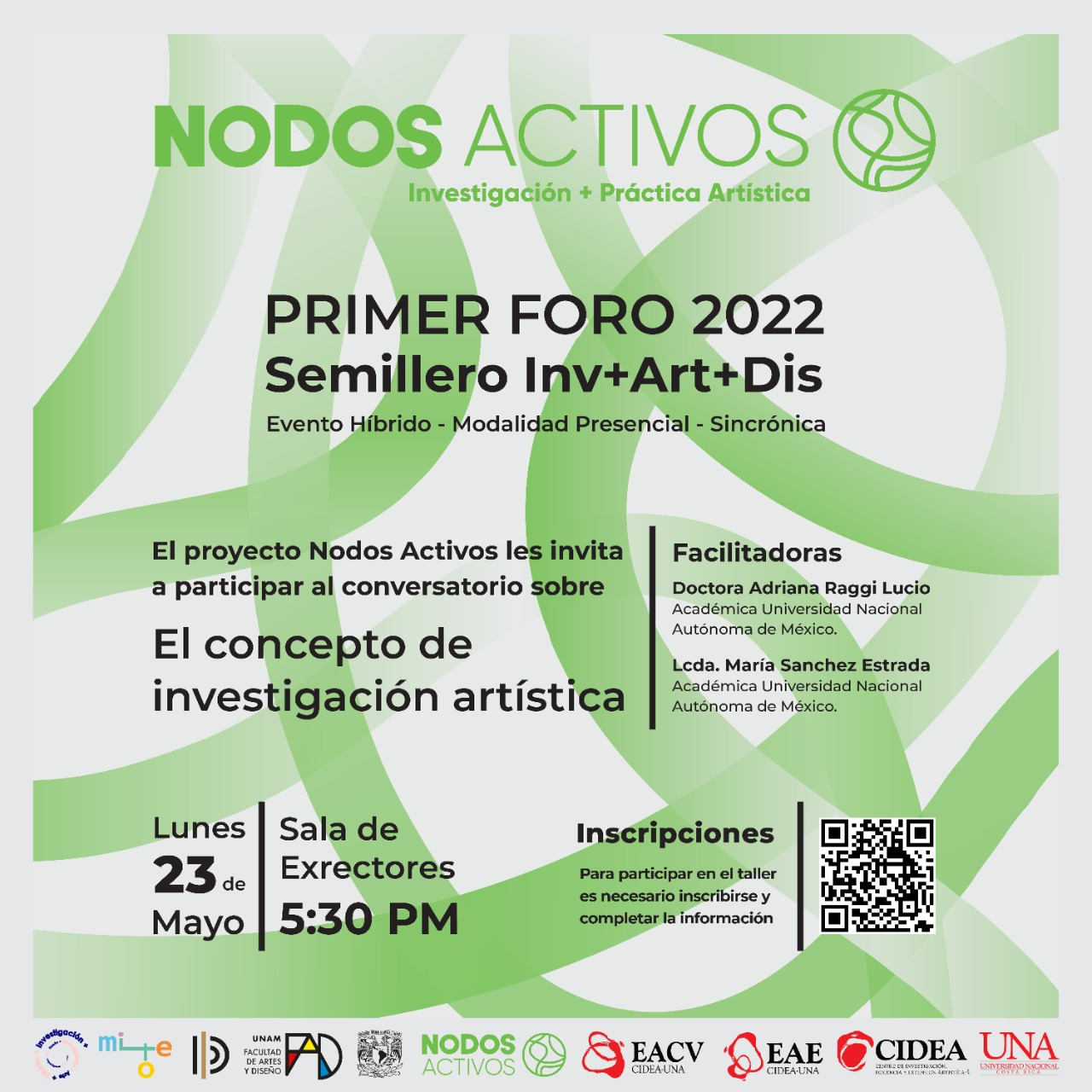 As the first intermittent forum (or Foro No.1) of the Nodos Activos project, 4 activities were carried out with the participation of Dr. Adriana Raggi, Lic. María Sánchez, and Mstr. Rubén Cerillo from UNAM, Mexico; and Dr. Alejandra Cano and Mag. Diego Romero from the National Pedagogical University of Colombia. Colleagues from Mexico physically visited Costa Rica for the activities, while the later Colombian academics did so digitally. In addition, the Foro No.1 counted with the participation of students, academics and graduates of the four different Centro de Investigación, Docencia y Extensión artística, CIDEA (Spanish for Research, Teaching and Artistic Extension Center). All activities took place on May 19, 20 and 23, 2022. All participating academics in this forum belong to the Arts and Design Research Network (INV+ART+DIS) in which the Nodos Activos project team is an active member since 2021.