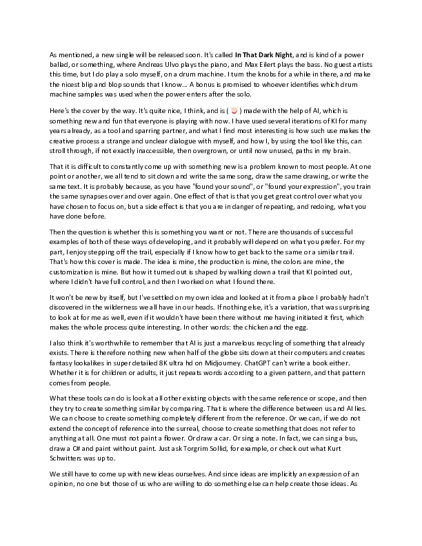 Så spørs det da, om det er noe man vil eller ikke. Det finnes tusenvis av vellykkede eksempler på begge disse måtene å utvikle seg på, og det dreier seg vel hovedsakelig om hva man selv foretrekker. For min del trives jeg godt med å tråkke utenfor stien, spesielt hvis jeg vet hvordan jeg skal komme meg tilbake igjen, i hvert fall tilbake til en sti som ligner. Det er sånn dette coveret er laget. Idéen er min, produksjonen er min, fargene er mine, tilpasningen er min. Men akkurat hvordan det ble seende ut er formet av en tur ut på en sti som KI pekte på, der jeg ikke hadde helt kontroll, og så jobbet jeg videre med det jeg fant der.