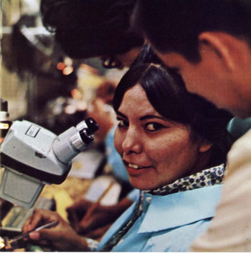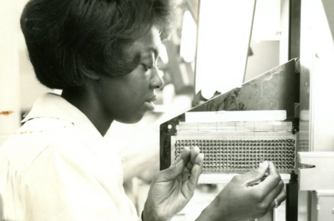 Later, during the Space Race, Margaret Hamilton did the programming for the Apollo mission and developed “priority displays”.91 A group of women known as “Little Old Ladies” would weave the code she had created with copper wires and magnetic cores. Copper wire inside the core was a 1, while a core with wire around it represented a 0.92 While the rich and powerful (men) were occupied with their rockets, the “Little Old Ladies” and Margaret Hamilton, their “rope mother”, hand-weaved physical code.93 Navajo women, employed by semiconductor company Fairchild, also contributed to the Apollo project by assembling integrated circuits. In a report, the company explains that there was a natural proclivity of women of this indigenous group to do this work due to “(...) years of rug weaving [which made] Indians (..) able to visualise complicated patterns and could, therefore, memorise com-