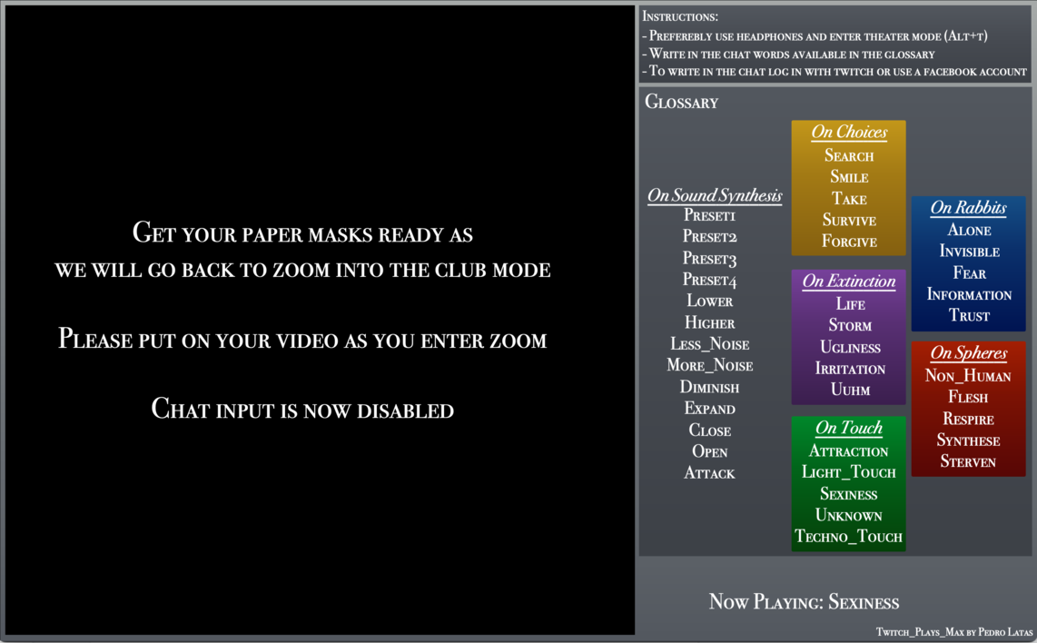 The interface streamed back to Twitch included the glossary of words participants could write on the chat and a visual feedback screen based on oscilloscope representations of the sound output. The glossary was composed of words relating to the other projects of Roots of the Future (“On Choices”, “On Rabbits”, “On Extinction”, “On Spheres”, “On Touch”) and words relating to synthesis parameters of a constant drone. Given the fact that many of the people present at the online concert didn’t have a musical background, there was an attempt to keep the words referring to sound synthesis somewhat ambiguous and “non-technical”, though moderately accurate with the sound modifications. Because this piece was still presented as an “interlude piece”, instead of the words pertaining to the other projects being all present from the beginning they were uncovered throughout the 5 iterations of the piece.