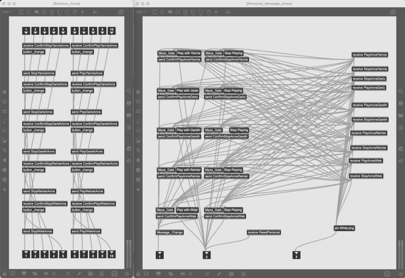 The system itself also needed more care and attention when it came to UI design and responsiveness. Because some buttons did not respond correctly during rehearsals, there was frustration and uncertainty among the players. This resulted in losing rehearsal time in order to understand how to navigate the faults of the system. This could be pin-pointed to the fact that the code wasn’t streamlined and the local internet connection was prone to failing. The concert with Aduantas mentioned before did not work out in the end. In the soundcheck and concert itself, the system kept on failing and the tablets were losing their connections too frequently, making it impossible to play the piece. The fact that I had hit my head against a glass door in a dark hallway at Korzo Theater 5 minutes before going on stage did not help the already precarious situation!