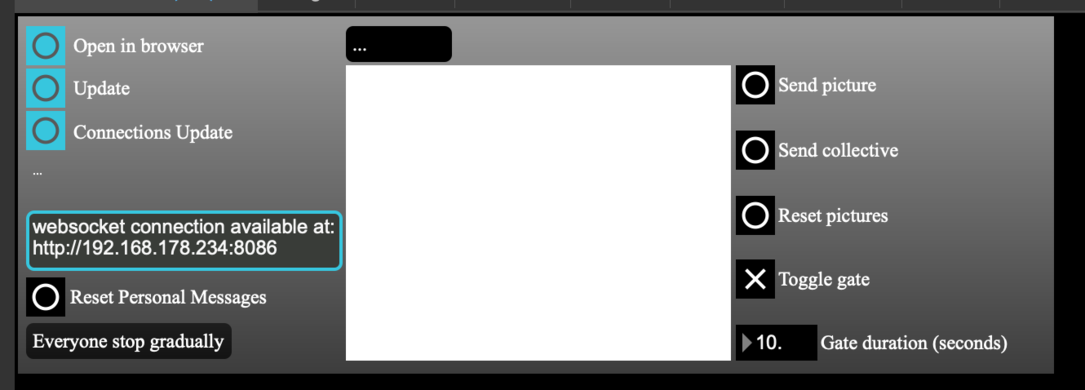The pictures would be sent by a person in charge of the controller interface and they would be sent individually, meaning that the performers didn’t receive the same picture at the same time. The performers are tasked to immerse themselves in the emotional world of each photo and transform their emotional content into sound through improvisation. This could be done by playing normally, reading the text, sharing a story that the picture reminds one of, etc… In the premiére of the piece, at the Online Spring Festival 2021, I was the one in charge of the controller interface and though I wasn’t performing with an instrument, my role was essential to curate the pace of this 10-minute piece. Furthermore, the person in charge of the controller interface also creates “collective moments”. In these moments, a small detail of a picture is sent to everyone with the command “Play Collectively”. These moments were designed to gather everyone in the same sound environment, which then would be broken apart by sending individual pictures again.35