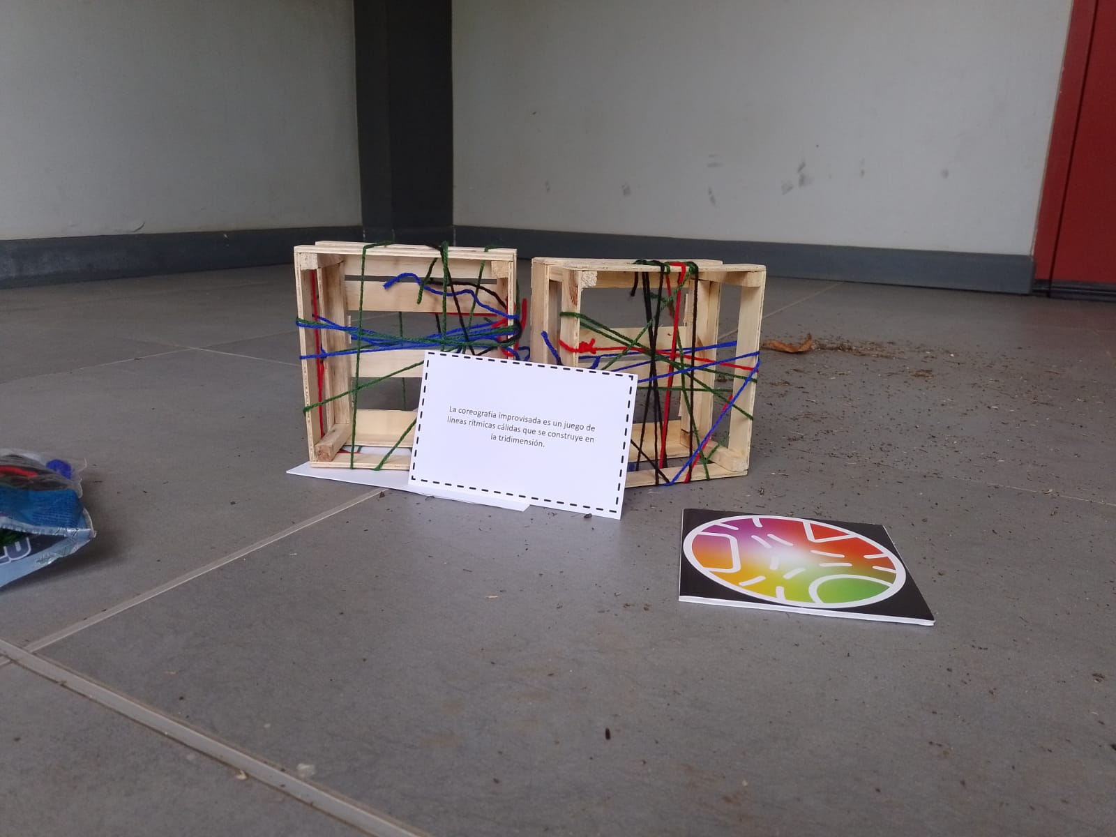 Objetivo del juego: Antes de iniciar el juego se otorgó a los participantes una consiga o acertijo que debían descifrar para comprender que debían hacer, esta consigna se pensó a partir de dos conceptos básicos pertenecientes a dos disciplinas, la coreografía improvisada de danza y las líneas rítmicas cálidas de arte y comunicación visual. Lo anterior se pensó para trabajar grupos interdisciplinarios donde uno o dos comprendieran a que se referían los conceptos, descifrar el acertijo e intercambiar roles para salir de la zona de confort, por ejemplo, que una estudiante de arte y comunicación visual realizara la coreografía improvisada mientras que una estudiante de danza jugaba con los hilos y el cubo.