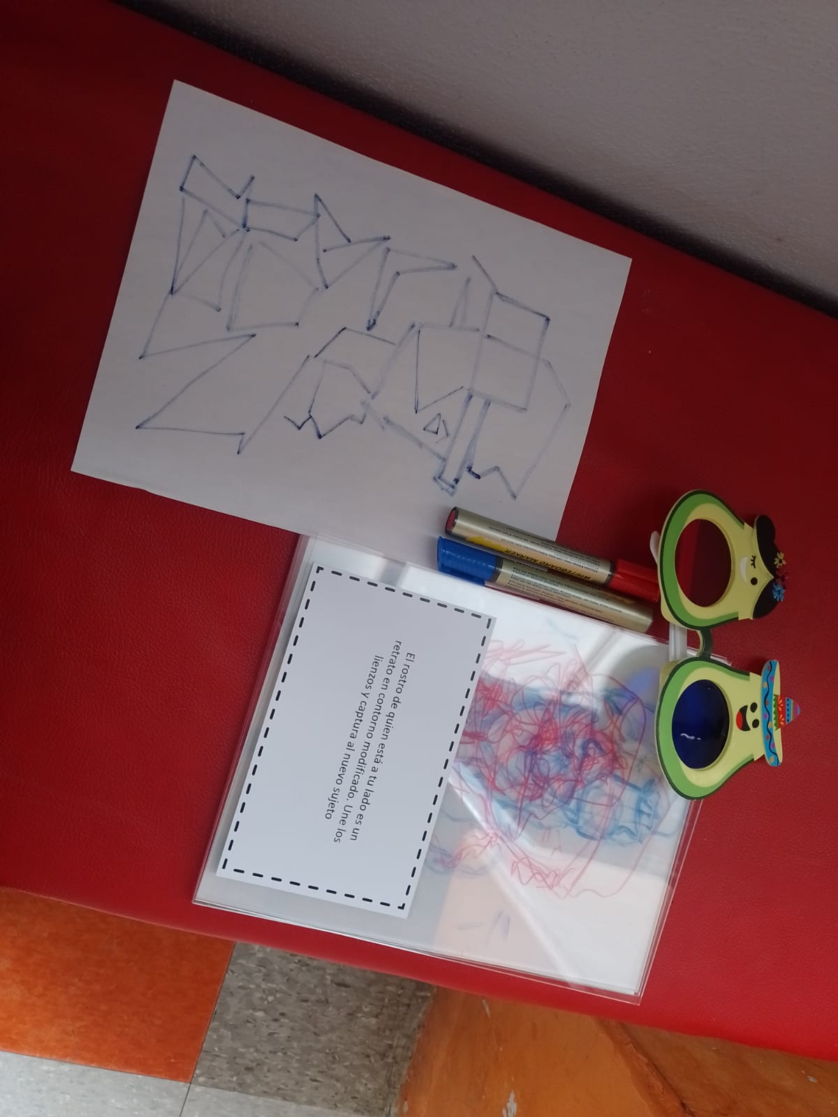 Teniendo todo esto en claro, la dinámica del juego constaba en un trabajo en parejas, en donde unos sostenían una lámina de acrílico frente a su rostro y la otra persona dibujaba el retrato utilizando el contorno modificado, utilizando un piloto de color rojo o azul. Después esto se hacíaa la inversa. Después de esto, se colocaban todos los dibujos uno sobre otro y se ponían en un fondo azul para que se pudieran apreciar de una mejor manera, es aquí cuando se les incitaba a utilizar las lentes con los filtros de colores para encontrar los dos rostros ocultos. . . . , uno que resulta del color rojo y el otro azul, es importante aclarar que el resultado de estos dibujos tenía una línea orgánica. Para probar la realización de estas dinámicas se requiere que los participantes graben un video y los publiquen en Instagram.