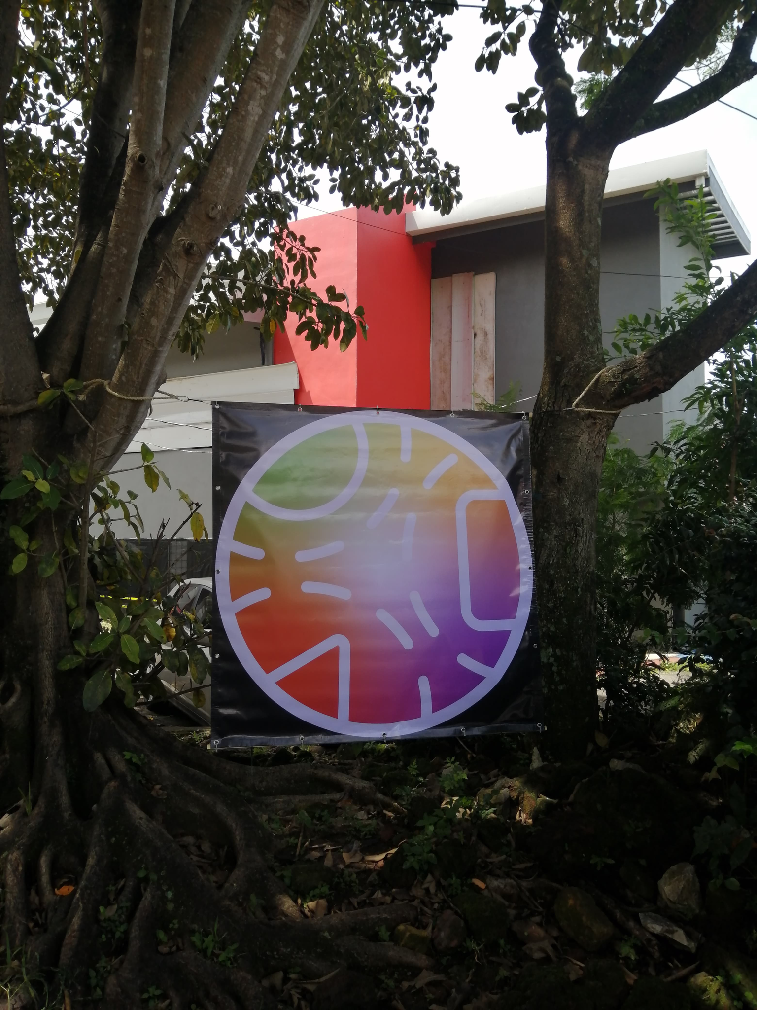 Para el juego se reinterpreta el logo de Nodos Activos 2023, en donde su fondo combina los colores que representan cada una de escuelas del CIDEA de una forma difuminada, esto con el proposito de representar visualmente la interdisciplinaridad. Por otro lado uno de los logos se diseña en un tamaño macro, para marcar el punto de encuentro incial del juego (arbol del trueque) y se diseñan logos pequeños en donde se colocaban en cada uno de los puntos del mapa que se consideran nodos en el CIDEA.
