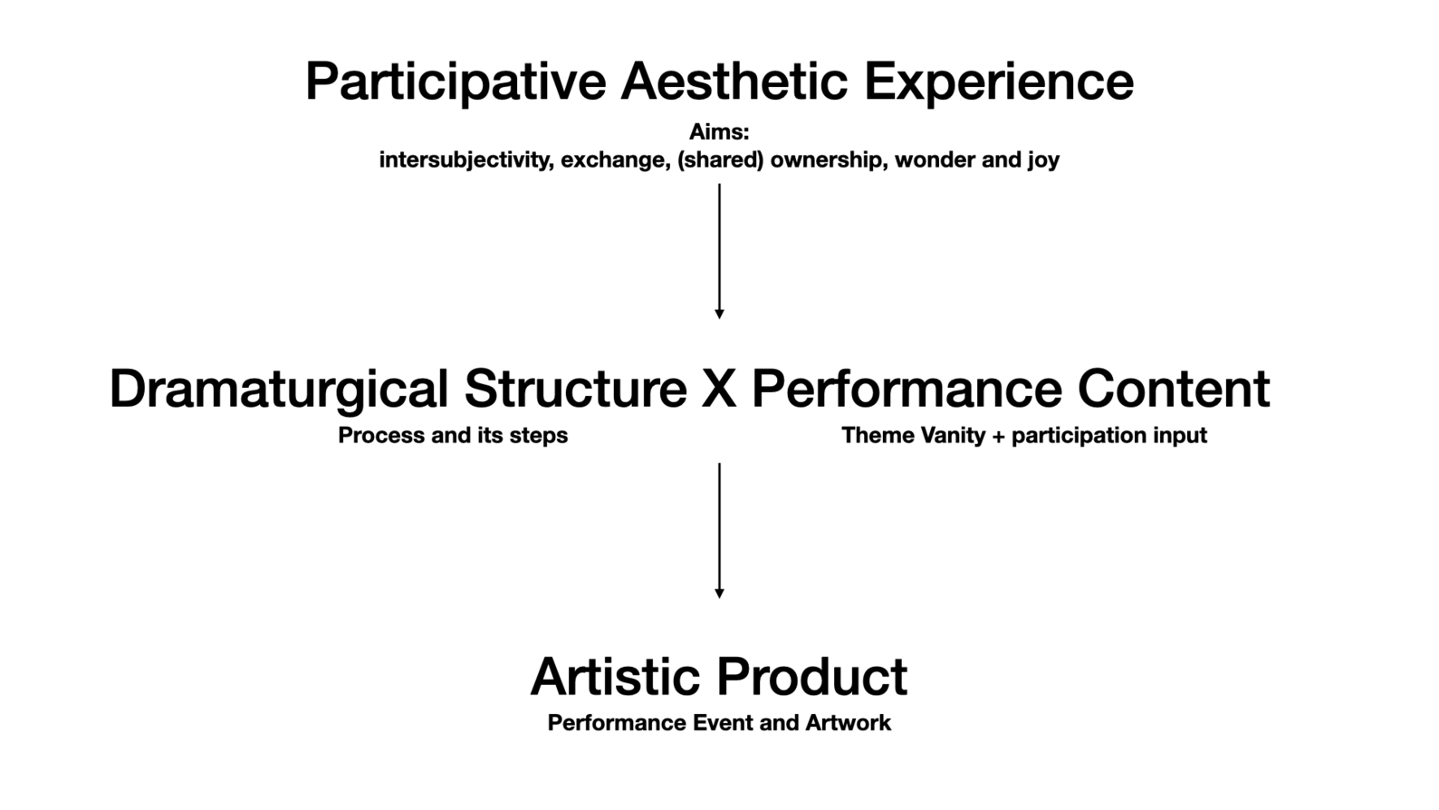 In the above model I state the goal of my artistic product - a Participative Aesthetic Experience. Aims that would make this experience succesful for me are creating a space of intersubjectivity, exchange, (shared) ownership, wonder and joy. I have elaborated on the meaning of these concepts here.
